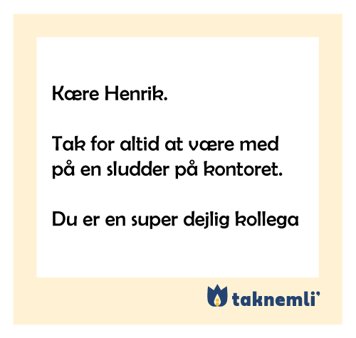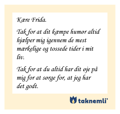 Et par venlige og velvalgte ord, et knus eller et smil kan sige meget. Er du mere tilpas med det, kan du også sende en besked eller lægge en lille hilsen på vennens eller kollegaens bord. Som inspiration får du her tre fine eksempler på tak-for-beskeder fra den virkelige verden: